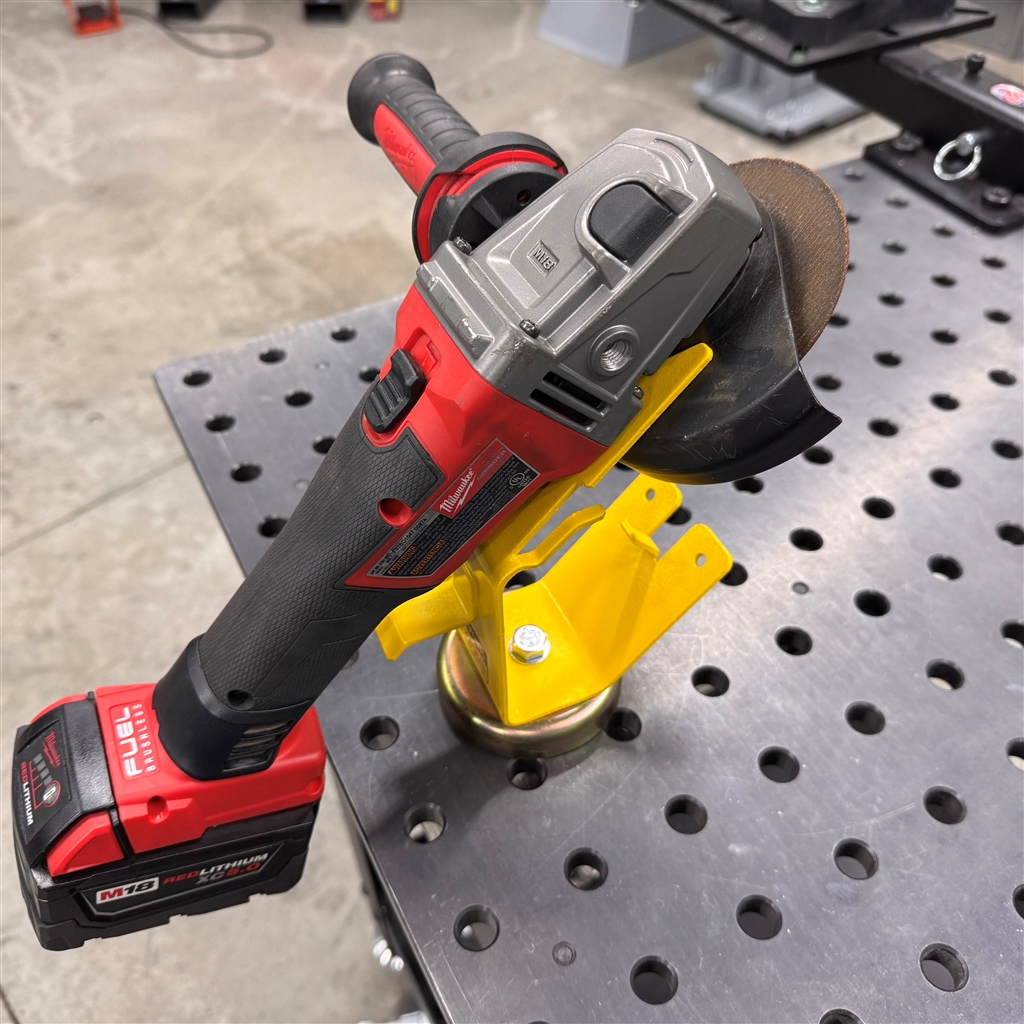 This Strong Hand Grinder Rest with magnetic base holds most 5 inch grinders along with spare discs and the ever-elusive wrench. Holds firmly with powerful magnets to your welding table or deburring station to keep everything close at hand.